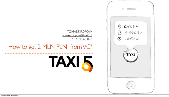 the Taxi5 to the investor it was already working in 9 major polish cities. MVP. THE LEADERS Daniel Rolkiewicz bullied the billboard network and sold it to the German company (2x). Tomasz Popów build the mobile, cloud and software house companies. 3 1 2VERIFIED MARKET IN THE EARLY STAGE Monthly in Poland are made 30 000 000 taxi orders. The found is investing in the trend / future. VERY ATRACTIVE BUSINESS MODEL It is the lead generation business model. poniedziałek, 3 czerwca 13