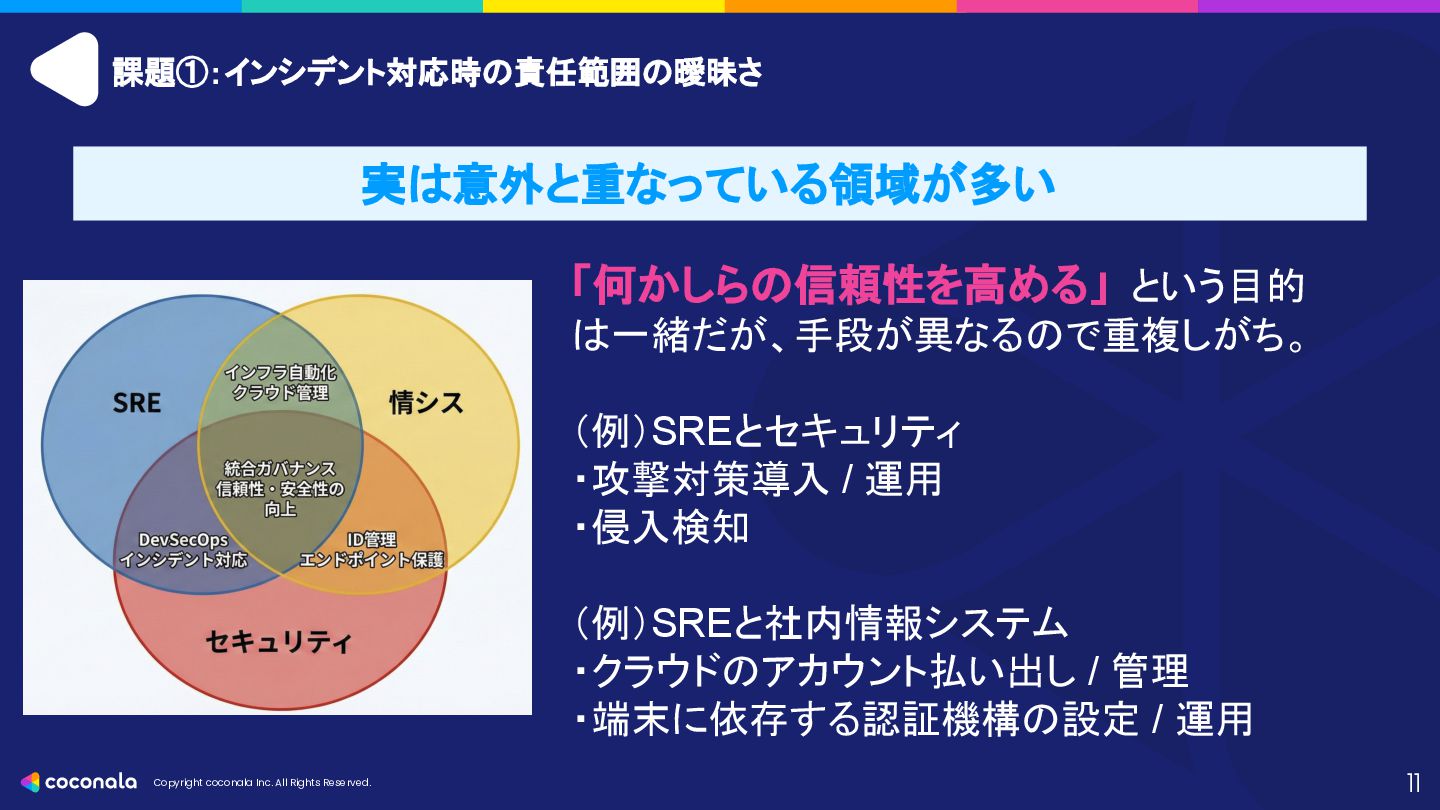 という目的 は一緒だが、手段が異なるので重複しがち。 (例)SREとセキュリティ ・攻撃対策導入 / 運用 ・侵入検知 (例)SREと社内情報システム ・クラウドのアカウント払い出し / 管理 ・端末に依存する認証機構の設定 / 運用