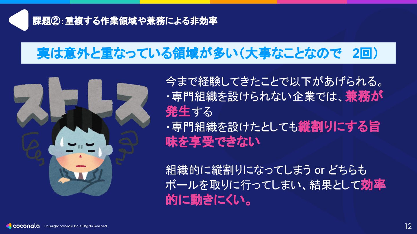 Copyright coconala Inc. All Rights Reserved. 課題②:重複する作業領域や兼務による非効率 12 実は意外と重なっている領域が多い(大事なことなので 2回)