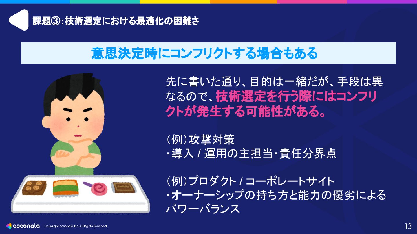 なるので、技術選定を行う際にはコンフリ クトが発生する可能性がある。 (例)攻撃対策 ・導入 / 運用の主担当・責任分界点 (例)プロダクト / コーポレートサイト ・オーナーシップの持ち方と能力の優劣による パワーバランス