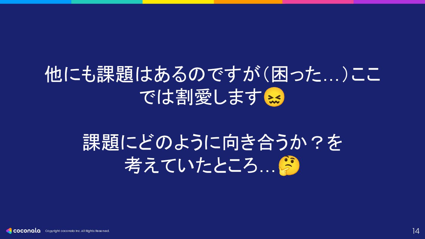 Copyright coconala Inc. All Rights Reserved. 課題③:技術選定における最適化の困難さ 13 意思決定時にコンフリクトする場合もある 先に書いた通り、目的は一緒だが、手段は異