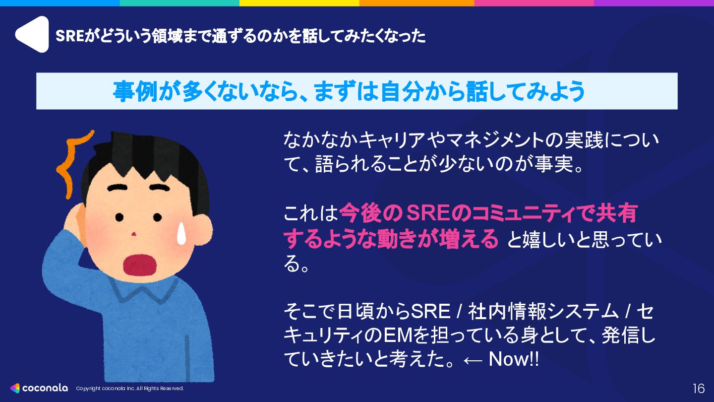 て、語られることが少ないのが事実。 これは今後のSREのコミュニティで共有 するような動きが増える と嬉しいと思ってい る。 そこで日頃からSRE / 社内情報システム / セ キュリティのEMを担っている身として、発信し ていきたいと考えた。 ← Now!!