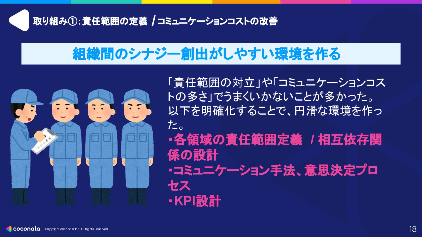 組織間のシナジー創出がしやすい環境を作る 「責任範囲の対立」や「コミュニケーションコス トの多さ」でうまくいかないことが多かった。 以下を明確化することで、円滑な環境を作っ た。 ・各領域の責任範囲定義 / 相互依存関 係の設計 ・コミュニケーション手法、意思決定プロ セス ・KPI設計