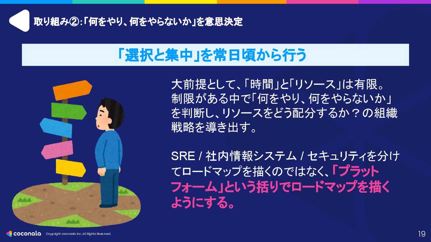 制限がある中で「何をやり、何をやらないか」 を判断し、リソースをどう配分するか?の組織 戦略を導き出す。 SRE / 社内情報システム / セキュリティを分け てロードマップを描くのではなく、「プラット フォーム」という括りでロードマップを描く ようにする。