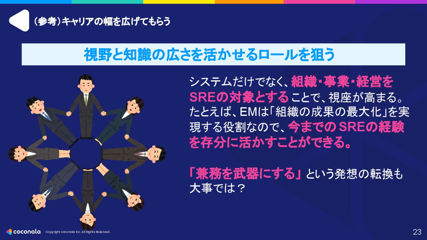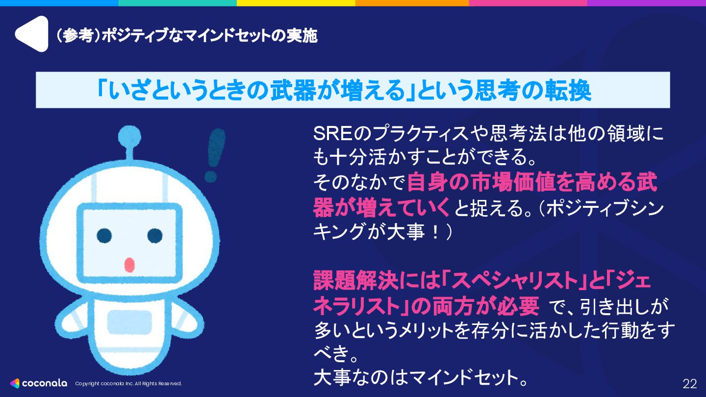 Copyright coconala Inc. All Rights Reserved. (参考)ポジティブなマインドセットの実施 22 「いざというときの武器が増える」という思考の転換 SREのプラクティスや思考法は他の領域に