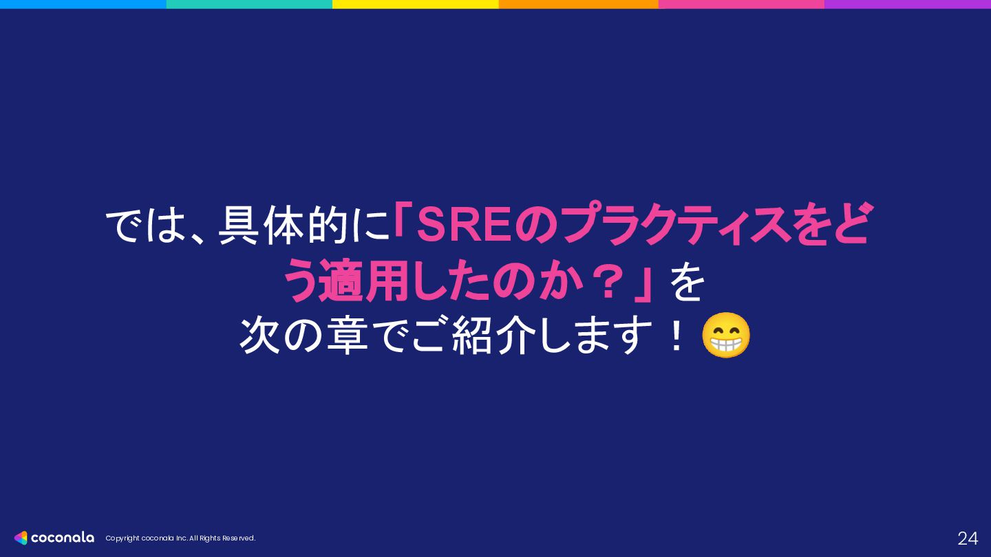 Copyright coconala Inc. All Rights Reserved. では、具体的に「SREのプラクティスをど う適用したのか?」 を 次の章でご紹介します!😁
