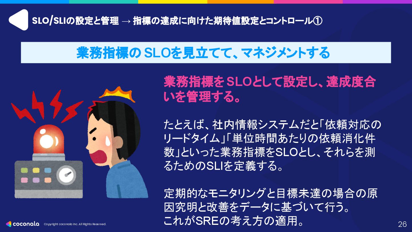 Copyright coconala Inc. All Rights Reserved. SLO/SLIの設定と管理 → 指標の達成に向けた期待値設定とコントロール① 26