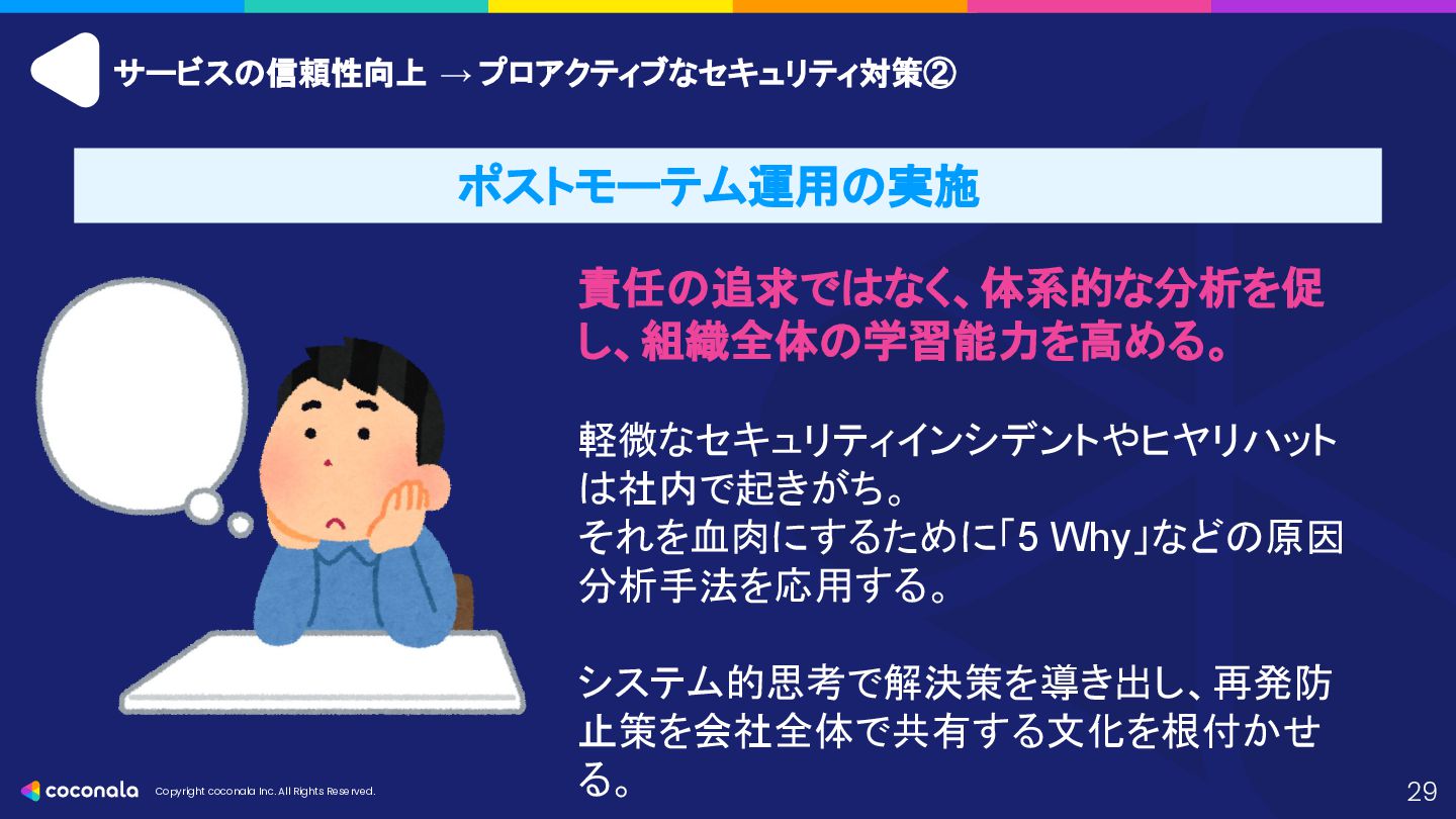 ポストモーテム運用の実施 責任の追求ではなく、体系的な分析を促 し、組織全体の学習能力を高める。 軽微なセキュリティインシデントやヒヤリハット は社内で起きがち。 それを血肉にするために「5 Why」などの原因 分析手法を応用する。 システム的思考で解決策を導き出し、再発防 止策を会社全体で共有する文化を根付かせ る。