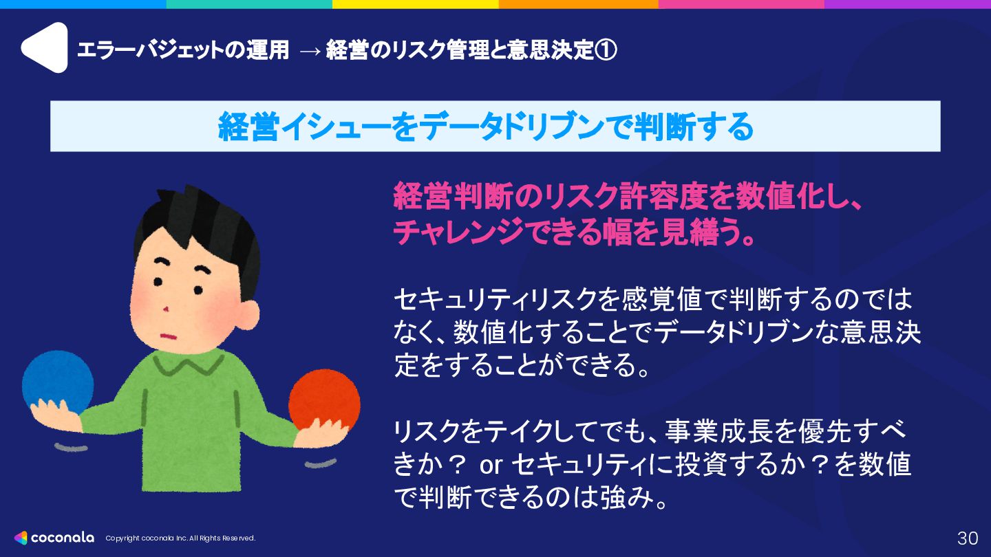 Copyright coconala Inc. All Rights Reserved. エラーバジェットの運用 → 経営のリスク管理と意思決定① 30