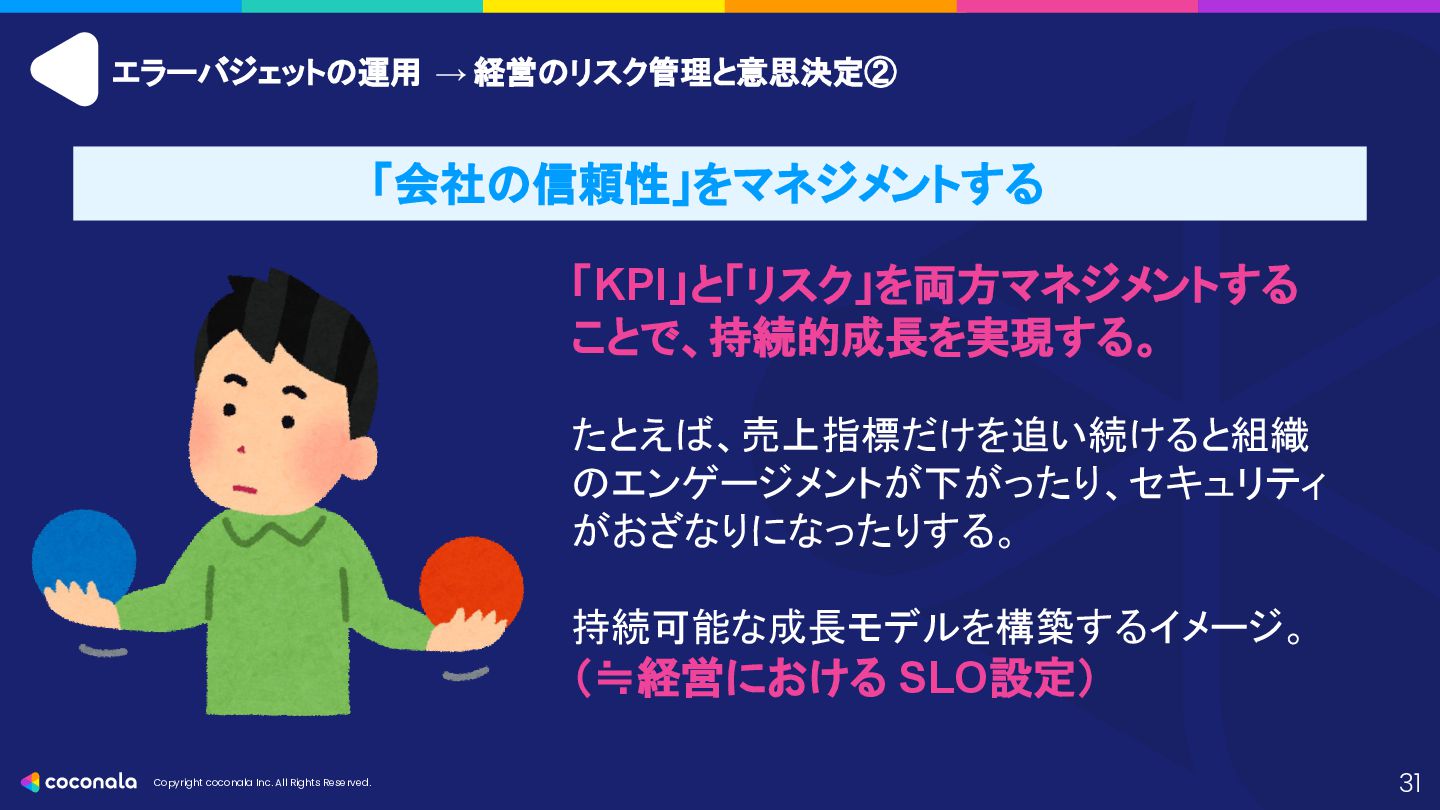 Copyright coconala Inc. All Rights Reserved. エラーバジェットの運用 → 経営のリスク管理と意思決定② 31