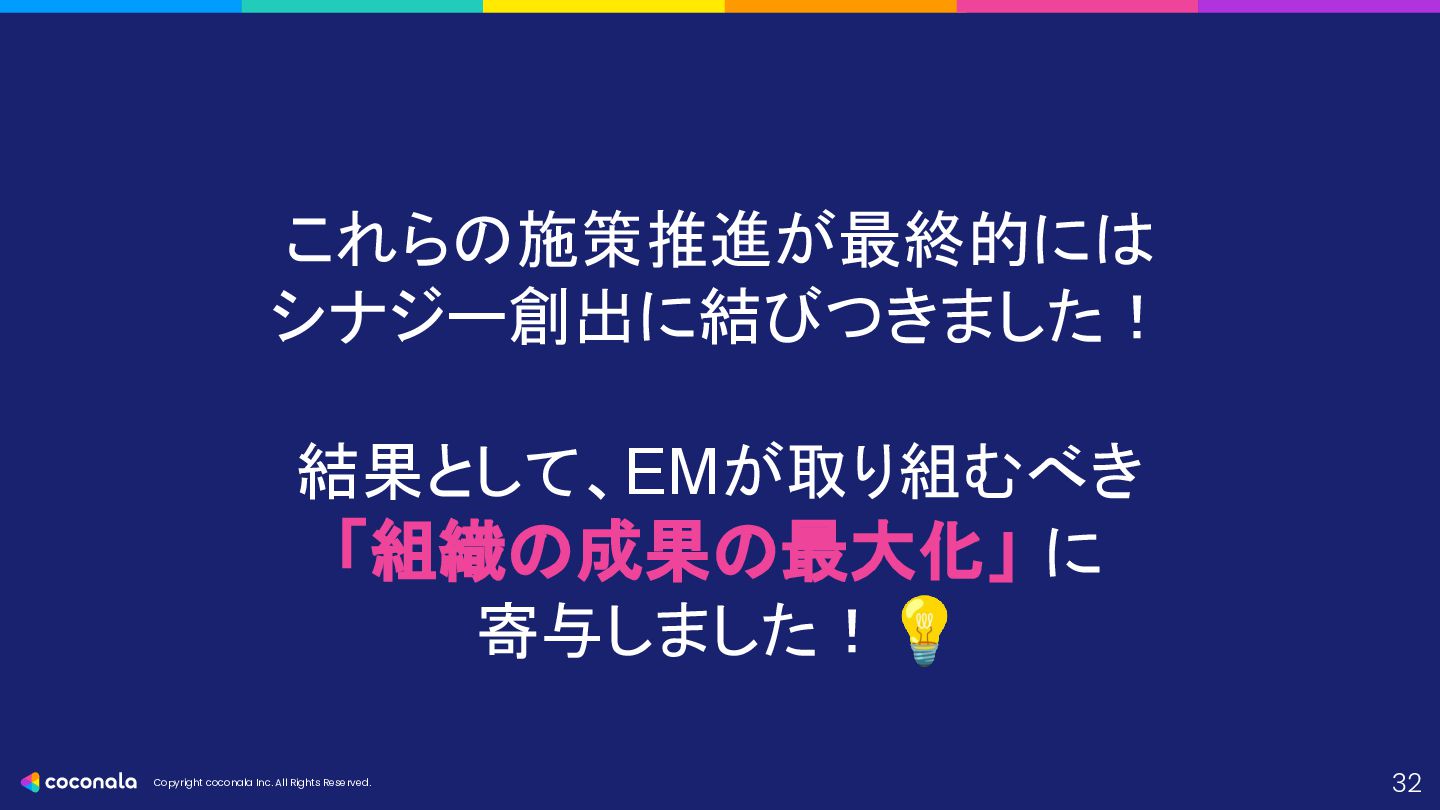 Copyright coconala Inc. All Rights Reserved. これらの施策推進が最終的には シナジー創出に結びつきました! 結果として、EMが取り組むべき 「組織の成果の最大化」