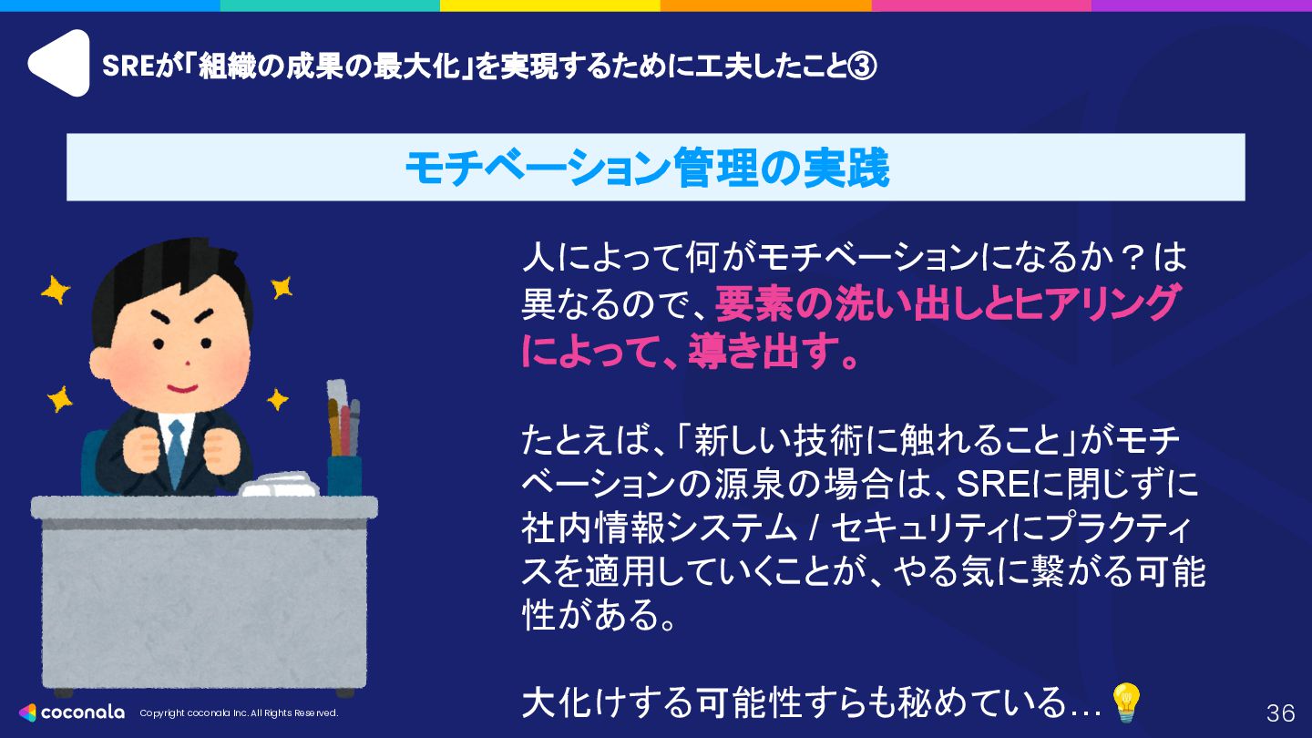 Copyright coconala Inc. All Rights Reserved. SREが「組織の成果の最大化」を実現するために工夫したこと③ 36 モチベーション管理の実践 人によって何がモチベーションになるか?は