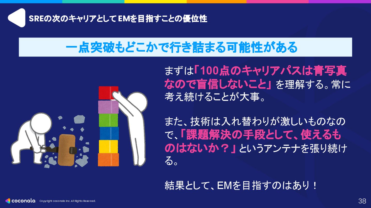 Copyright coconala Inc. All Rights Reserved. SREの次のキャリアとして EMを目指すことの優位性 38 一点突破もどこかで行き詰まる可能性がある