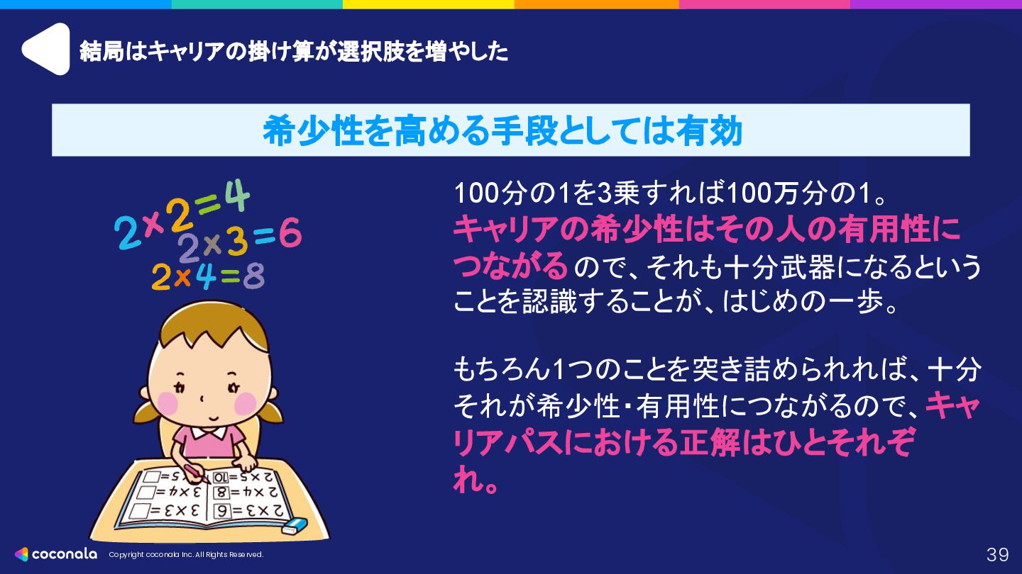 Copyright coconala Inc. All Rights Reserved. 結局はキャリアの掛け算が選択肢を増やした 39 希少性を高める手段としては有効 100分の1を3乗すれば100万分の1。