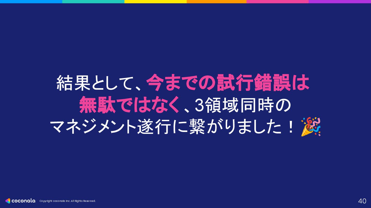 Copyright coconala Inc. All Rights Reserved. 結果として、今までの試行錯誤は 無駄ではなく 、3領域同時の マネジメント遂行に繋がりました!🎉
