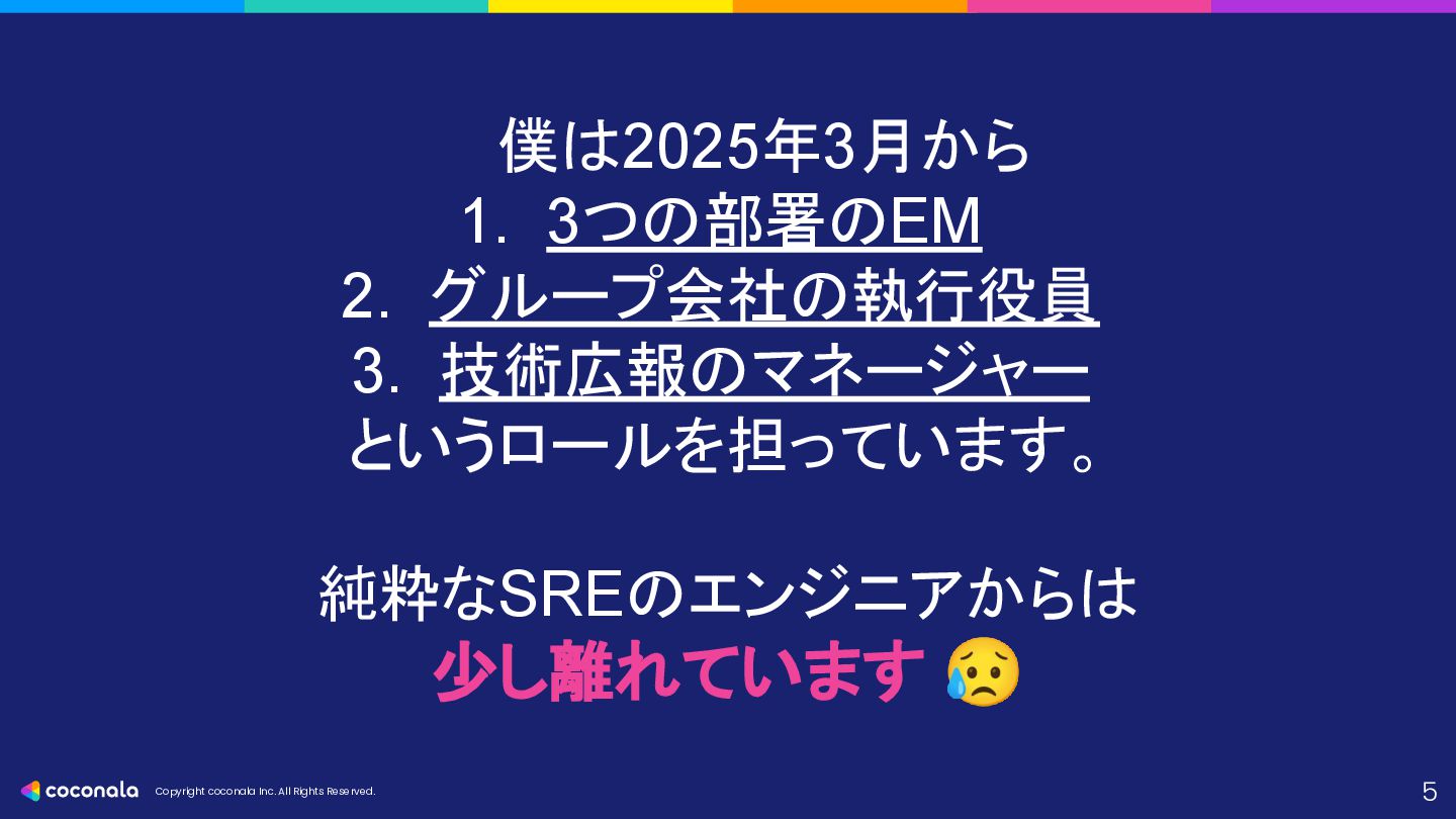 グループ会社の執行役員 3. 技術広報のマネージャー というロールを担っています。 純粋なSREのエンジニアからは 少し離れています 😥 5