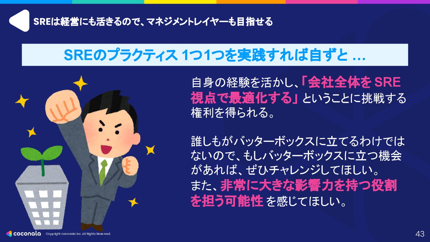 Copyright coconala Inc. All Rights Reserved. SREは経営にも活きるので、マネジメントレイヤーも目指せる 43 SREのプラクティス 1つ1つを実践すれば自ずと