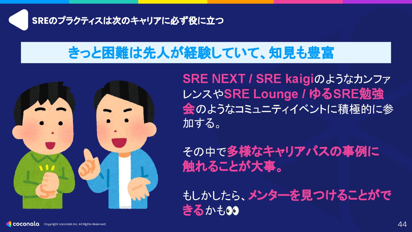 NEXT / SRE kaigiのようなカンファ レンスやSRE Lounge / ゆるSRE勉強 会のようなコミュニティイベントに積極的に参 加する。 その中で多様なキャリアパスの事例に 触れることが大事。 もしかしたら、メンターを見つけることがで きるかも👀