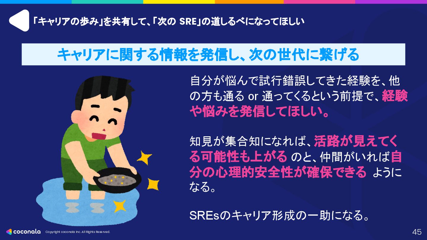 自分が悩んで試行錯誤してきた経験を、他 の方も通る or 通ってくるという前提で、経験 や悩みを発信してほしい。 知見が集合知になれば、活路が見えてく る可能性も上がる のと、仲間がいれば自 分の心理的安全性が確保できる ように なる。 SREsのキャリア形成の一助になる。