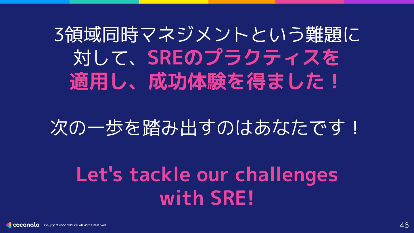 Copyright coconala Inc. All Rights Reserved. 3領域同時マネジメントという難題に 対して、SREのプラクティスを 適用し、成功体験を得ました! 次の一歩を踏み出すのはあなたです!