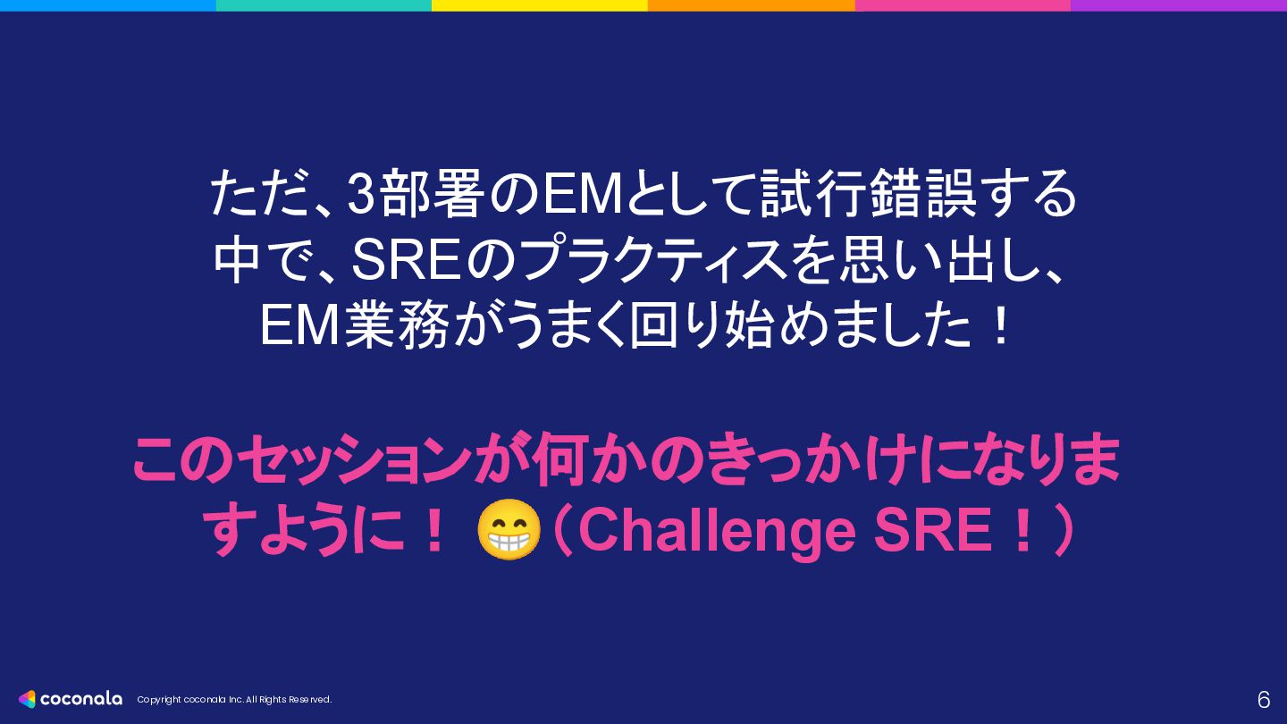 Copyright coconala Inc. All Rights Reserved. ただ、3部署のEMとして試行錯誤する 中で、SREのプラクティスを思い出し、 EM業務がうまく回り始めました! このセッションが何かのきっかけになりま