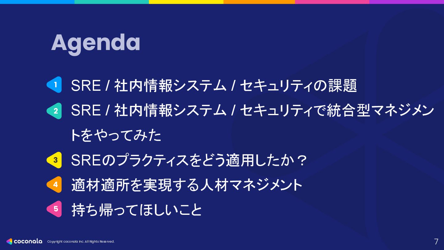 社内情報システム / セキュリティの課題 SRE / 社内情報システム / セキュリティで統合型マネジメン トをやってみた SREのプラクティスをどう適用したか? 適材適所を実現する人材マネジメント 持ち帰ってほしいこと 2 1 5 3 4