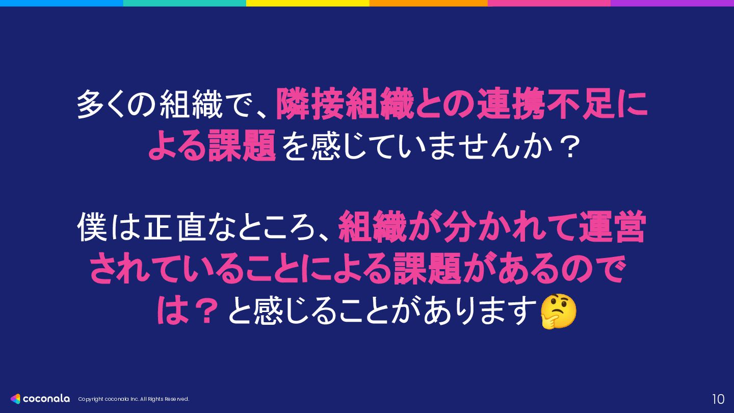 Copyright coconala Inc. All Rights Reserved. 多くの組織で、隣接組織との連携不足に よる課題を感じていませんか? 僕は正直なところ、組織が分かれて運営 されていることによる課題があるので