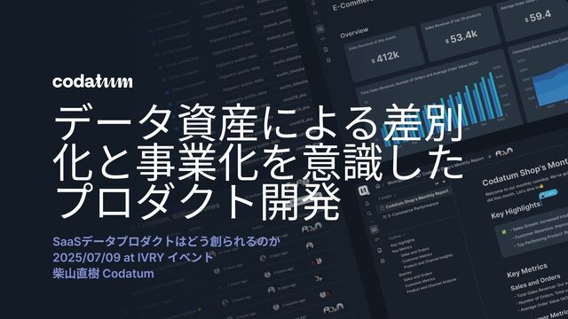 組織のデジタルリテラシーの向上が見込める 誰でも “自分で” 自由度の高い分析を行い、 データを詳しく見ていくことができる。 高速なデータ分析サイクルを組織の力に 数秒のサイクル ビジネスメンバー・マネージャー AI Assistant 総PV数と3時間ごとの移動平均を、jaに絞ってライ ンチャートにしてください 1 2 3 4 5 6 7 SELECT FROM WHERE * datehour >= ( datehour < ( pageviews_2024 { }date_range.StartD { }date_range.EndDat TIMESTAMP TIMESTAMP Th is query aggreg ate s the to tal p age v iew s by hour for the J ap ane se W ik iped ia and c alcul ate s the 3-hour mov ing aver age. To v isu al ize the to tal p age v iew s ( PV) and c alcul ate the 3-hour mov ing aver age for the W ik iped ia d ata f il tered to J ap ane se ( ja), we w ill need to mod ify the SQL query accord ingly and prov ide the ch ar t co nf igur atio n. SQL 1 2 3 4 5 6 7 8 9 10 1 1 1 2 1 3 14 SELECT AS OVER ORDER BY FROM WHERE AND AND GROUP BY ORDER BY datehour, (views) total_views, ( (views)) ( datehour datehour >= ( ) datehour < ( ) wiki = datehour datehour SUM AVG SUM TIMESTAMP TIMESTAMP pageviews_2024 '2024-01-02' '2024-01-03' 'ja' コ ードから学習 して、AI に依 頼す るだけ で分析可能 Codatum をいれ ると AI Assistant Cod atumが解決する課題 AI を使った 高度で高速な分析 2 for ビジネス・マネージャー ブラック ボック スになっ て いないので レビューが 容易 エンジ ニア (レビ ュアー ) Tommy a few second s a go 集計 が 正確か確認し た方 が 良い かも