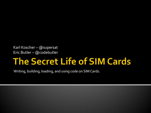 This talk, based on our experience building SIM apps for the Toorcamp GSM network, explains what (U)SIM Toolkit Applications are, how they work, and how to develop them. We will explain the various pieces of technology involved, including the Java Card standard, which lets you write smart card applications using a subset of Java, and the GlobalPlatform standard, which is used to load and manage applications on a card. We will also talk about how these applications can be silently loaded, updated, and interacted with remotely over-the-air.