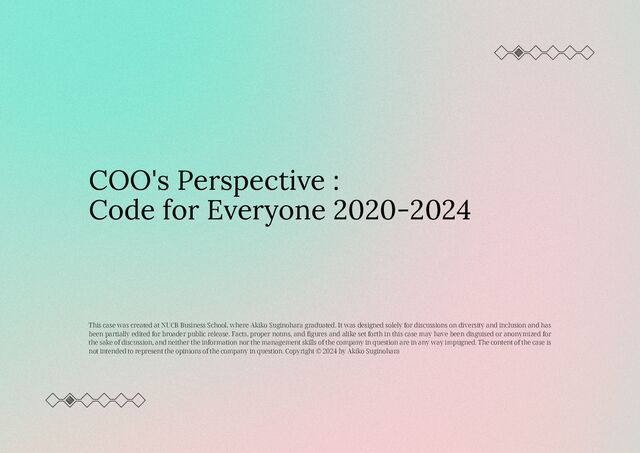 (A Japanese translation of “Building For Everyone: Expand Your Market With Design Practices From Google’s Product Inclusion Team” by Annie Jean-Baptiste) [2] (*) Perez, C.C. Sonzai shinai onna tachi (Invisible women). Kawade Shobo Shinsha Publishers (A Japanese translation of “Invisible Women: Exposing Data Bias in a World Designed for Men” by Caroline Criado Perez) [3] (*) Organization for Economic Co-operation and Development (OECD). (2018). Shakai Jodoteki Skill – Manabi ni mukau chikara (Social Emotional Skill – Power that Drives Learning). Akashi Shoten. [4] (*) Matsubara, A., Ohkoso M. (2022) Kyoryoku no technology (Cooperation Technology). Gakugei Shuppansha. [5] (*) Code.org, official website, https://code.org/ (Accessed on June 26, 2024) [6] Post, C., Lokshin, B. and Boone, C. (2021). Research: Adding Women to the C-Suite Changes How Companies Think. Harvard Business Review. (Accessed on July 12, 2024) [7] (*) Forbes Japan. 30 UNDER 30 JAPAN. https://forbesjapan.com/feat/30under30/2020/ (Accessed on August 08, 2024) [8] (*) Forbes Japan. A non-profit start-up led by a former RAKSUL executive to work on a new interdisciplinary approach to solve societal issues. https://forbesjapan.com/articles/detail/71603 (Accessed on July 04, 2024) [9] (*) Hour of Code. Official website. https://hourofcode.com/jp (Accessed on June 26, 2024) [10] Gompers, P. and Kovvali, S. (2018). The Other Diversity Dividend. Harvard Business Review. (Accessed on July 28, 2024) [11] (*) Waffle. Official website. https://waffle-waffle.org/ (Accessed on June 26, 2024) [12] (*) Credit Suisse. Gender 3000 Report. https://www.credit- suisse.com/media/assets/corporate/docs/about-us/media/media-release/2019/10/2019-10-18-cs-gender- 3000-press-release-japan-ja.pdf (Accessed on July 04, 2024) [13] (*) Ministry of Economy, Trade and Industry. Nadeshiko Issues Report 2022. https://www.meti.go.jp/policy/economy/jinzai/diversity/R4nadeshikoreport.pdf (Accessed on July 04, 2024) [14] (*) Keizai Doyukai (Japan Association of Corporate Executives). Collaborative Capitalism. https://www.doyukai.or.jp/newsrelease/2023/kyojo.htmls (Accessed on July 04, 2024) [15] (*) International Institute for Management Development (IMD). World Digital Competitiveness Ranking 2023 – Japan ranks 32nd , a record low again. https://www.imd.org/news/world_digital_competitiveness_ranking_202311/ (Accessed on July 04, 2024) [16] (*) National Women’s Education Center. Research Report on Career and Lives of Schoolteachers. https://www.nwec.go.jp/about/publish/2018/ecdat60000002eli.html (Accessed on July 04, 2024) [17] (*) World Economic Forum. Gender Gap Index 2024. https://jp.weforum.org/publications/global- gender-gap-report-2024/ (Accessed on July 04, 2024) [18] (*) Suntory Holdings. Suntory “Your are Limitless” Fund. https://www.suntory.co.jp/company/csr/kimi_wa_michisu/program.html (Accessed on July 26, 2024) [19] (*) Statistics Bureau, Ministry of Internal Affairs and Communications. Statistics Topics No. 137: Number of Children in Our Country. https://www.stat.go.jp/data/jinsui/topics/topi1371.html (Accessed on July 04, 2024) [20] (*) Ministry of Internal Affairs and Communications. White Paper 2016 - Information and Telecommunications in Japan. https://www.soumu.go.jp/johotsusintokei/whitepaper/h28.html (Accessed on July 13, 2024) [21] (*) Ministry of Internal Affairs and Communications. Basic Survey on Schools / Survey on Elementary and Junior High Schools, Vocational Schools, and Other Types of Schools 2023, Survey on Correspondence School Education (High Schools) and Survey Paper on Schools (Elementary Schools). https://www.e- stat.go.jp/stat-search/files?stat_infid=000040127829 (Accessed on July 14, 2024) [22] (*) Cabinet Office. Policy Package concerning Education and Human Resource Development to Achieve Society 5.0. https://www8.cao.go.jp/cstp/tyousakai/kyouikujinzai/saishu_print.pdf (Accessed on July 04, 2024) Bibliography: (*) refers to the information written in the Japanese language. [23] (*) Cabinet Office. Historical Changes in the Number of Certifications for A corporation engaging in specified non-profit activities. https://www.npo-homepage.go.jp/about/toukei-info/ninshou-seni (Accessed on June 26, 2024) [24] (*) (Cabinet Office. Fact-finding Survey on corporations engaging in specified non-profit activities. https://www.npo-homepage.go.jp/toukei/npojittai-chousa/2023npojittai-chousa (Accessed on June 26, 2024) [25] (*) Gender Equality Bureau, Cabinet Office. Promotion of Women on Corporate Boards in Japan and Other Countries. www.gender.go.jp/kaigi/senmon/keikaku_kanshi/siryo/pdf/ka15-2.pdf (Accessed on July 12, 2024) [26] (*) Gender Equality Bureau, Cabinet Office. White Paper on Gender Equality 2024. https://www.gender.go.jp/about_danjo/whitepaper/r05/zentai/pdfban.html (Accessed on July 12, 2024) [27] (*) Japan Productivity Center. Labor Productivity Statistics in Japan: 2015. https://www.jpc- net.jp/research/assets/pdf/R89attached2.pdf (Accessed on July 12, 2024) [28] (*) Nomura Research Institute. 49% of Japan's Workforce Can Be Replaced by Artificial Intelligence, Robots and alike. https://www.nri.com/-/media/Corporate/jp/Files/PDF/news/newsrelease/cc/2015/151202_1.pdf (Accessed on July 04, 2024) [29] (*) Agency for Cultural Affairs. Easy Japanese Language Guideline to Support Foreign Residents Living in Japan, and so forth. https://www.bunka.go.jp/seisaku/kokugo_nihongo/kyoiku/92484001.html (Accessed on July 26, 2024) [30] (*) Code for Everyone. Official website. https://code.or.jp/ (Accessed on June 26, 2024) [31] (*) Code for Everyone. Annual Report 2019. https://code.or.jp/wp- content/uploads/2023/11/2019_activity_report.pdf (Accessed on July 14, 2024) [32] (*) Code for Everyone. Fact-Finding Survey on Programming Education and High School ‘Informatics I’ Subject, FY2022 Edition. https://speakerdeck.com/codeforeveryone/2022nian-du-hurokuraminkujiao-yu- gao-xiao-qing-bao-i-shi-tai-diao-cha-bao
