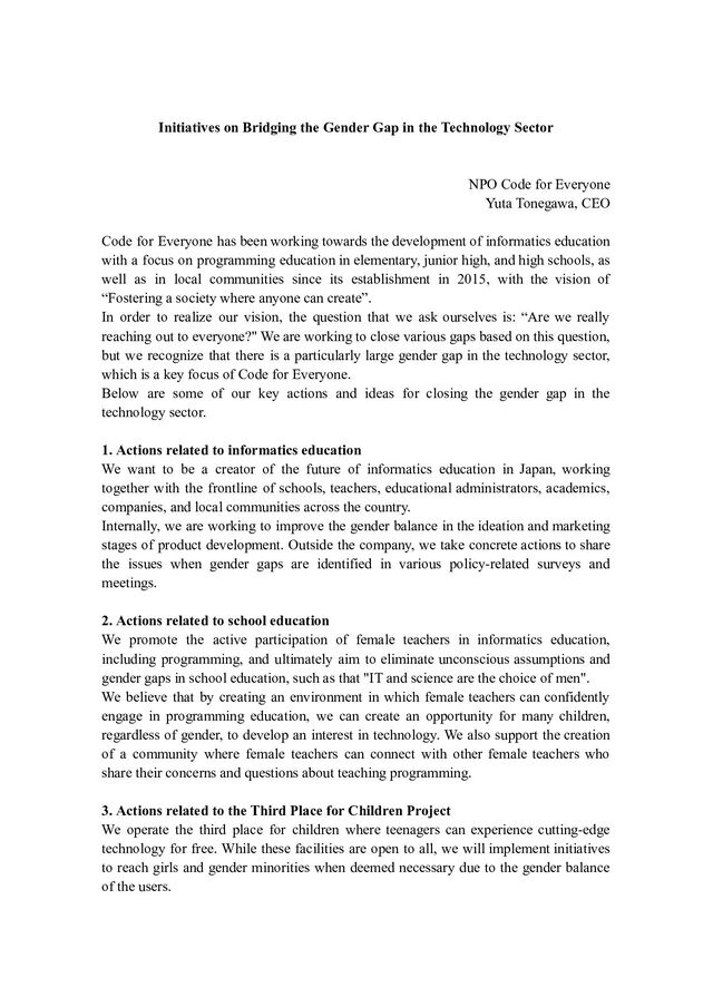 NPO Code for Everyone Yuta Tonegawa, CEO Code for Everyone has been working towards the development of informatics education with a focus on programming education in elementary, junior high, and high schools, as well as in local communities since its establishment in 2015, with the vision of “Fostering a society where anyone can create”. In order to realize our vision, the question that we ask ourselves is: “Are we really reaching out to everyone?" We are working to close various gaps based on this question, but we recognize that there is a particularly large gender gap in the technology sector, which is a key focus of Code for Everyone. Below are some of our key actions and ideas for closing the gender gap in the technology sector. 1. Actions related to informatics education We want to be a creator of the future of informatics education in Japan, working together with the frontline of schools, teachers, educational administrators, academics, companies, and local communities across the country. Internally, we are working to improve the gender balance in the ideation and marketing stages of product development. Outside the company, we take concrete actions to share the issues when gender gaps are identified in various policy-related surveys and meetings. 2. Actions related to school education We promote the active participation of female teachers in informatics education, including programming, and ultimately aim to eliminate unconscious assumptions and gender gaps in school education, such as that "IT and science are the choice of men". We believe that by creating an environment in which female teachers can confidently engage in programming education, we can create an opportunity for many children, regardless of gender, to develop an interest in technology. We also support the creation of a community where female teachers can connect with other female teachers who share their concerns and questions about teaching programming. 3. Actions related to the Third Place for Children Project We operate the third place for children where teenagers can experience cutting-edge technology for free. While these facilities are open to all, we will implement initiatives to reach girls and gender minorities when deemed necessary due to the gender balance of the users.