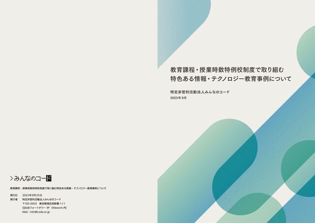 本報告書は、自治体や学校長が教育課程特例校・授業時数特例校制度の仕組みを活用し、地域や学校の資源を活用しながらプログラミングを含む情報教育の充実・発展に取り組む選択の参考情報となることを目指し、作成したものです。