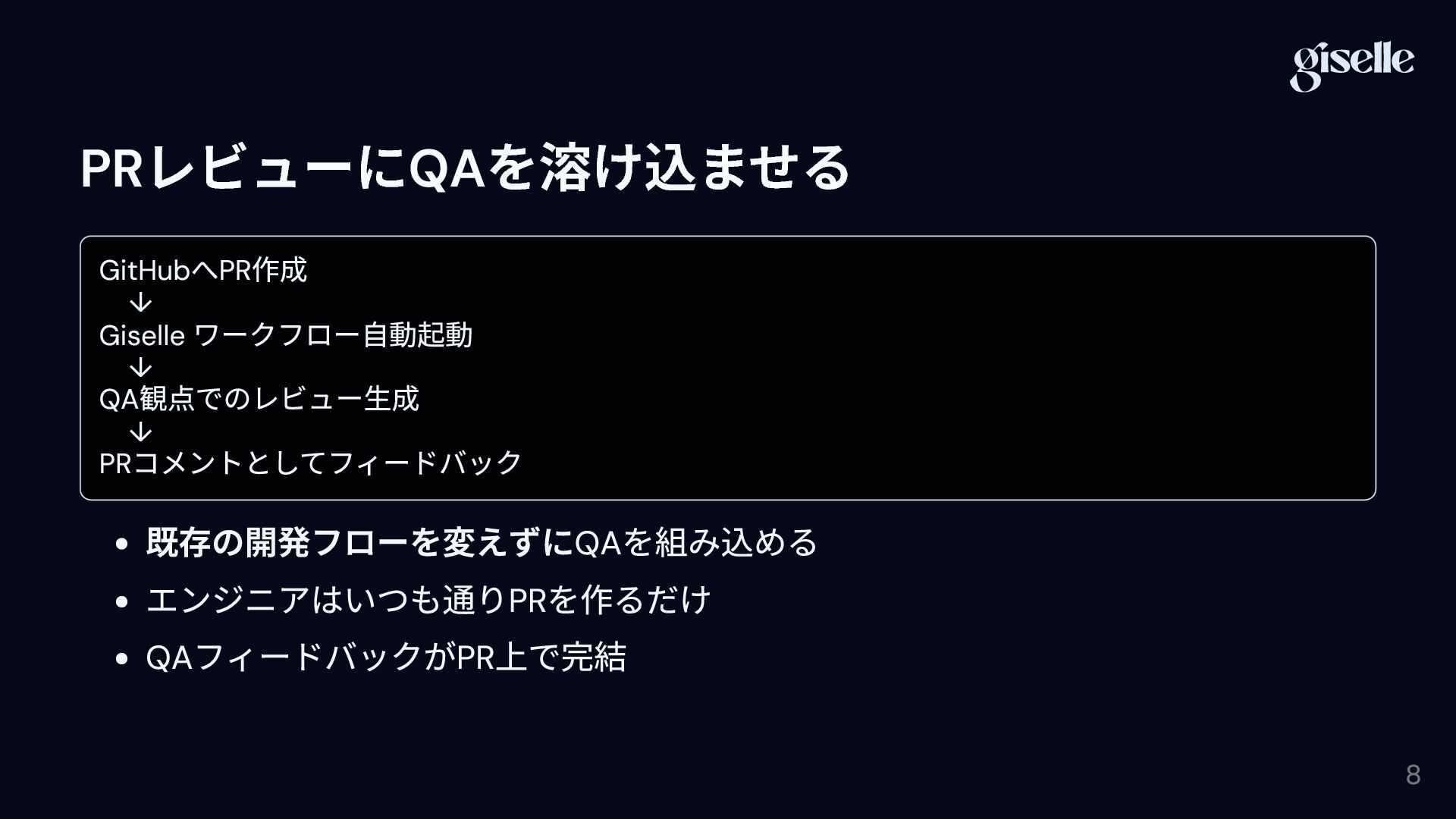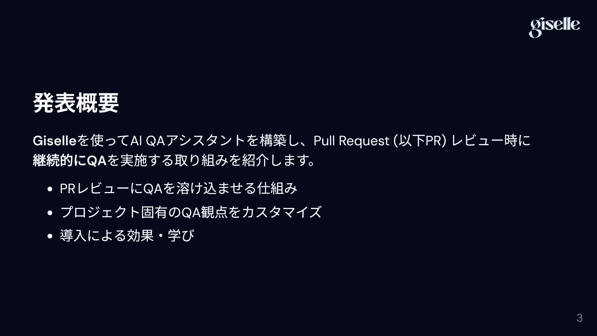 2. 発表概要 Giselle を使ってAI QA アシスタントを構築し、Pull Request ( 以下PR) レビュー時に 継続的にQA