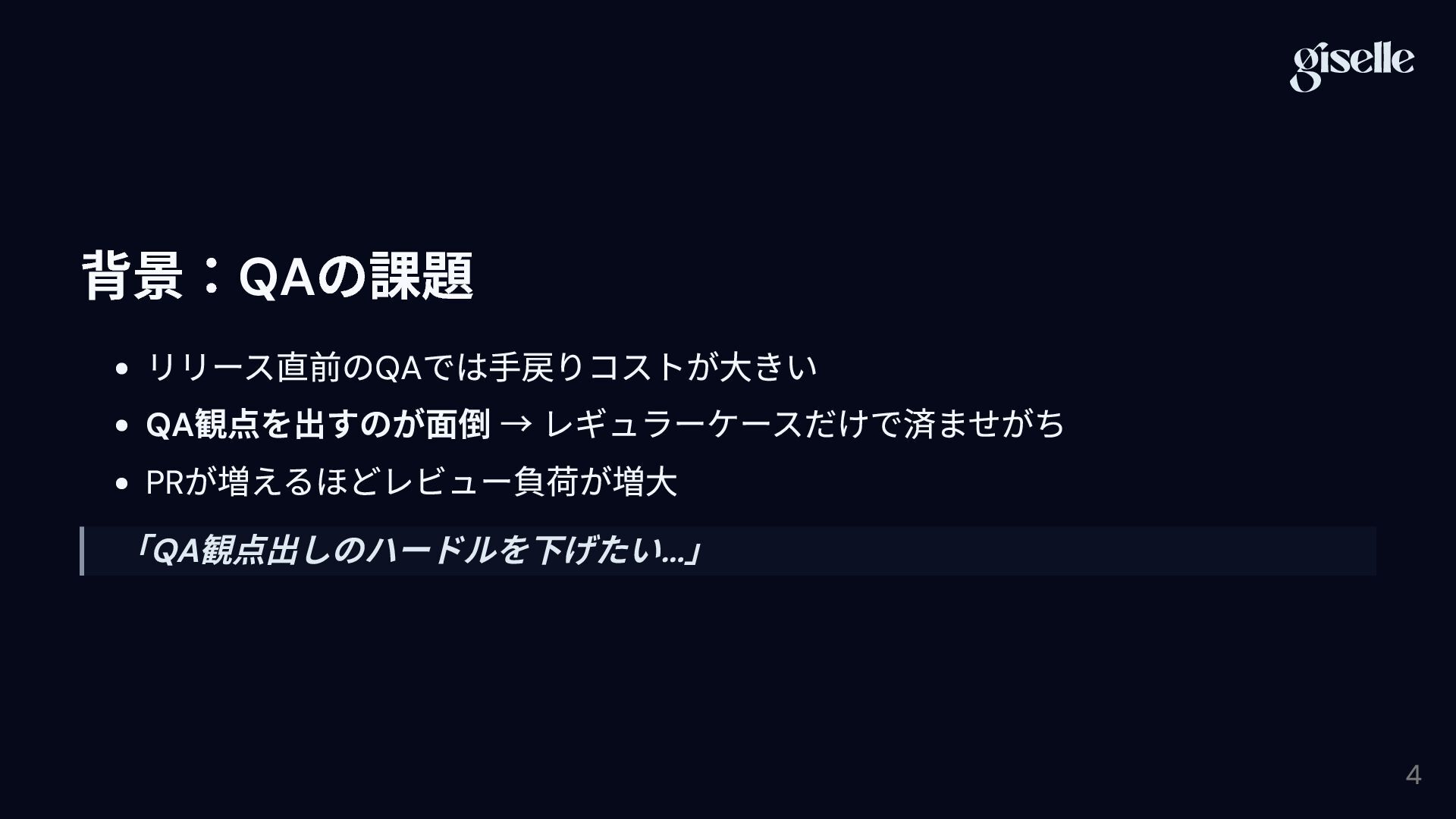 を実施する取り組みを紹介します。 PR レビューにQA を溶け込ませる仕組み プロジェクト固有のQA 観点をカスタマイズ 導入による効果・学び 3