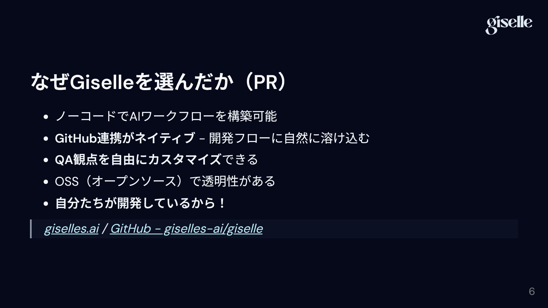 観点を自由にカスタマイズできる OSS (オープンソース)で透明性がある 自分たちが開発しているから! giselles.ai / GitHub - giselles-ai/giselle 6