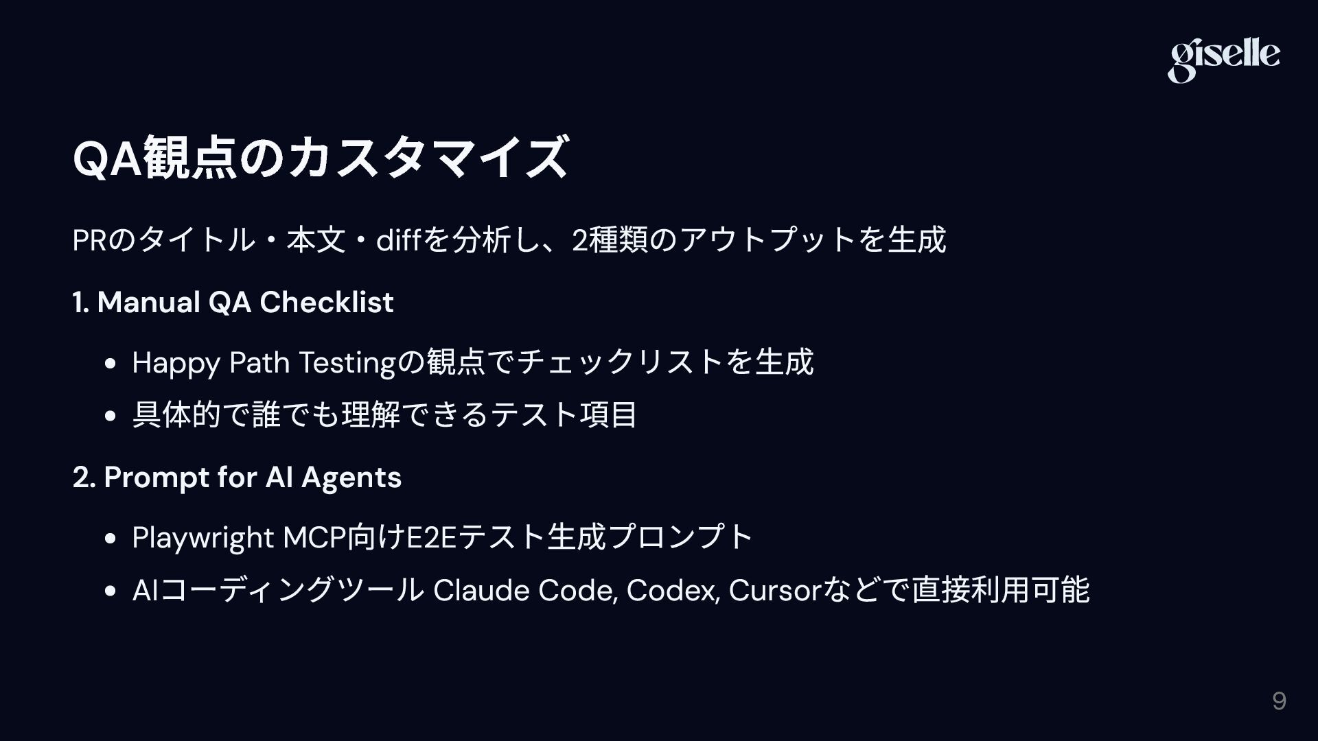 Happy Path Testing の観点でチェックリストを生成 具体的で誰でも理解できるテスト項目 2. Prompt for AI Agents Playwright MCP 向けE2E テスト生成プロンプト AI コーディングツール Claude Code, Codex, Cursor などで直接利用可能 9