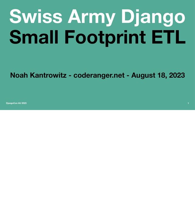 and again —Cool but not very small DjangoCon AU 2023 9 To touch on it briefly, a lot of fancy folks have been thoughtleadering about ELT instead of ETL. It's the same core idea but rather than storing just the transformed data, you first store the raw stuff so that you could re-transform it later if needed. If that's a feature you need then by all means pursue it, but if your raw data is big it can dramatically increase both system complexity and storage requirements. And since we're here to talk about small systems, I don't think it's for us.
