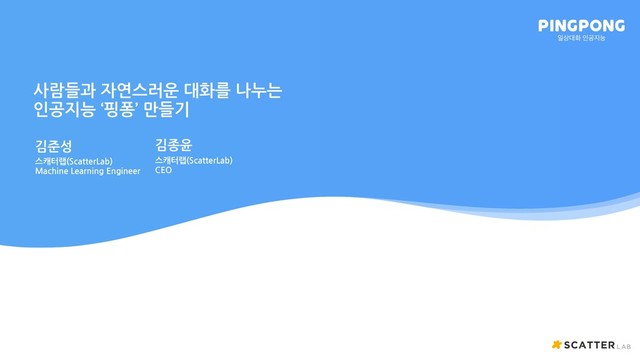 100억 건의 카카오톡 데이터로 어떻게 똑똑하고 생동감 넘치는 대화형 인공지능을 만들었는지 공유하는 세션입니다. 인공지능을 위한 일상대화 기술인 '핑퐁'과, 사용자가 직접 새로운 패르소나의 캐릭터를 만들수 있게 해주는 "핑퐁 빌더"를 소개합니다. 기존 FAQ 방식의 챗봇 모델이 아닌, 카카오톡 데이터의 장점을 활용할 수 있는 Reply-centric 기반의 학습 방법을 공유합니다. 또한 세션 마지막에는 핑퐁이 얼마나 똑똑하고, 인간 같은 대화를 할 수 있는지 보여주는 놀라운 데모가 준비되어 있습니다. 지금도 m.me/ai.pingpong 에서 페이스북 메신저로 핑퐁과 대화해보실 수 있습니다!