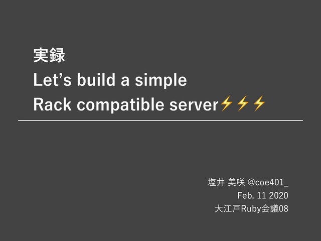 ‘/’, 21 ‘QUERY_STRING’ => @query || ‘’, 22 ‘METHOD’ => @method || ‘GET’, 23 ‘SERVER_NAME’ => ‘simple_rack_campatible_server’, 24 ‘SERVER_PORT’ => @port.to_s, 25 ‘rack.version’ => Rack::VERSION, 26 ‘rack.input’ => StringIO.new(@input || ‘’).set_encoding(‘ASCII_8BIT’), 27 ‘rack.errors’ => $stderr, 28 ‘rack.multiprocess’ => false, 29 ‘rack.multithread’ => false, 30 ‘rack.run_once’ => false, 31 ‘rack.url_scheme’ => @scheme&.downcase&.slice(/http[a-z]*/) || ‘http’ 32 } 33 end simple_rack_compatible_server.rb 4JNQMF3BDL$PNQBUJCMF4FSWFS4FSWFSFOW ⚡3BDLΞϓϦέʔγϣϯͷ࣮ߦʹඞཁͳڥมΛ༻ҙ