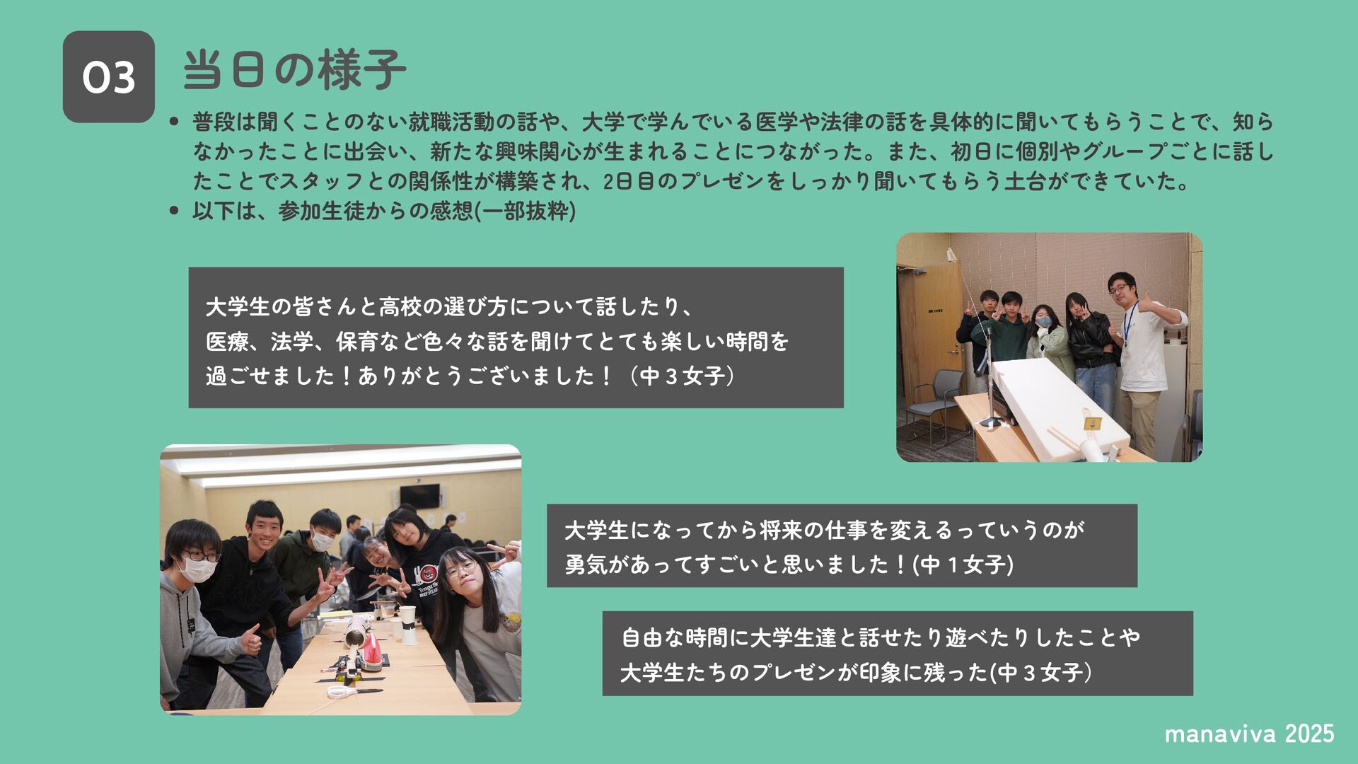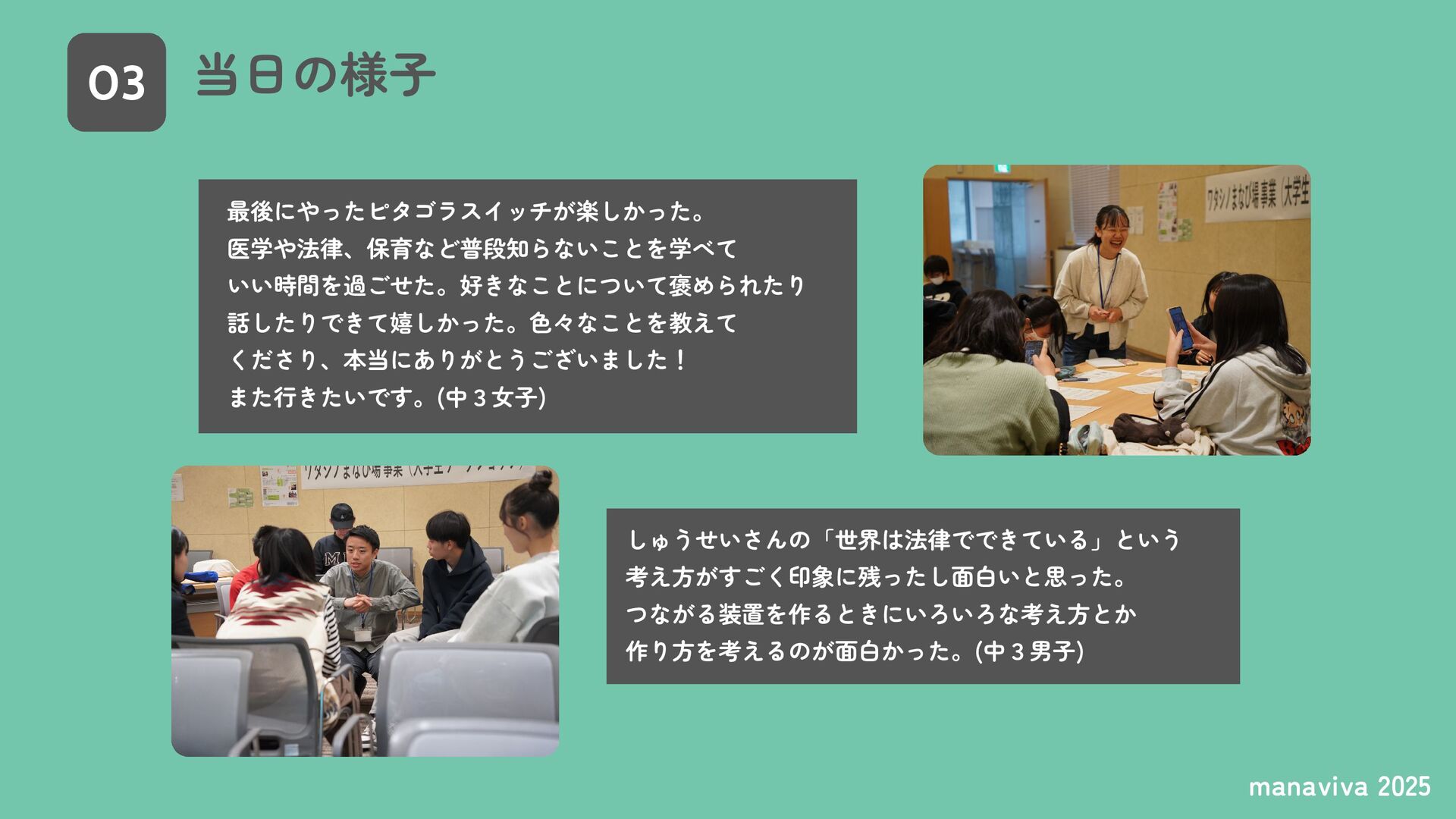 自由な時間に大学生達と話せたり遊べたりしたことや 大学生たちのプレゼンが印象に残った(中3女子) 大学生になってから将来の仕事を変えるっていうのが 勇気があってすごいと思いました!(中1女子) 大学生の皆さんと高校の選び方について話したり、 医療、法学、保育など色々な話を聞けてとても楽しい時間を 過ごせました!ありがとうございました!(中3女子) 当日の様子 03 manaviva