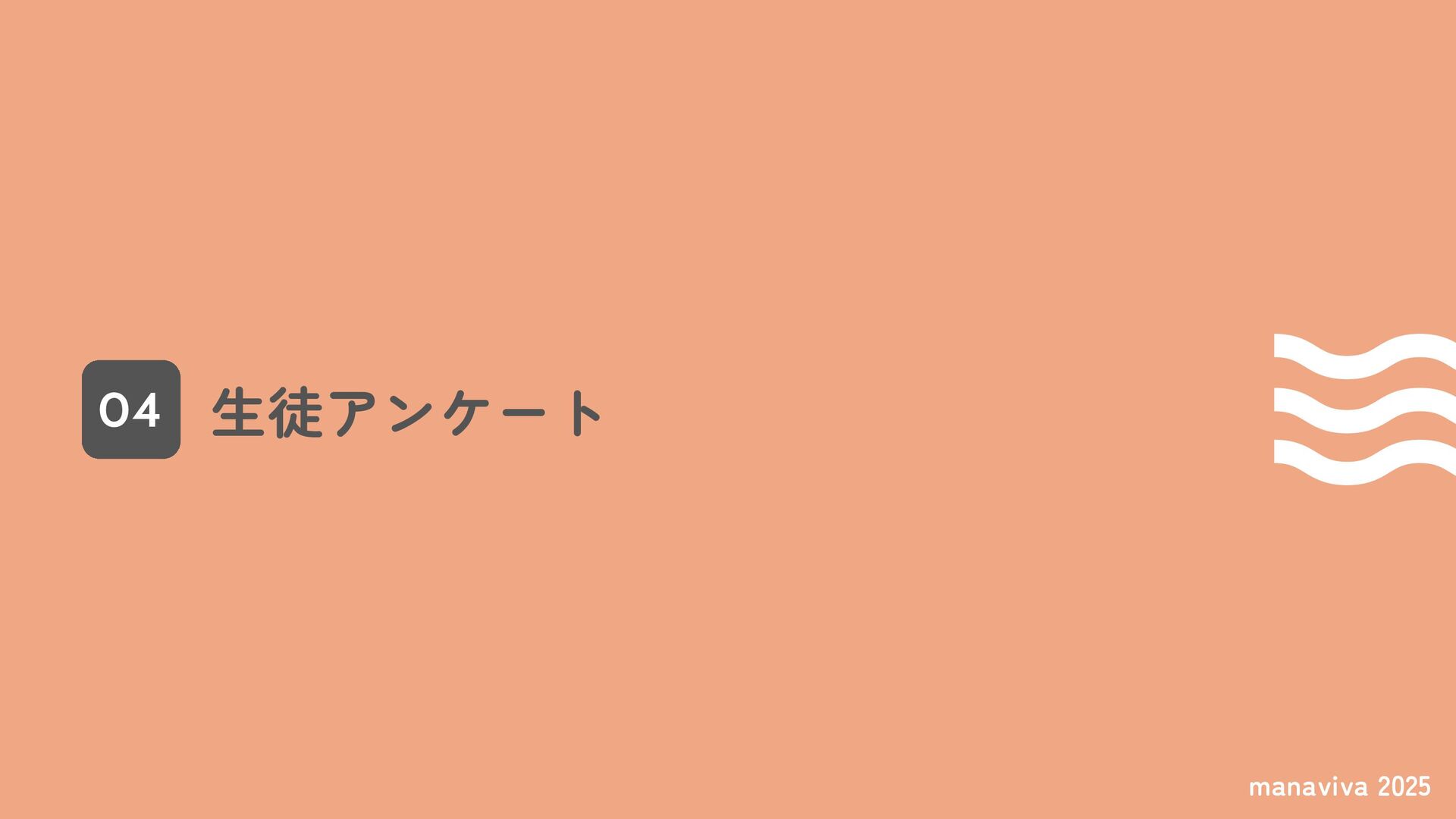 はじめに 当日の様子 まなび場で行ったこと 生徒アンケート 01 03 02 04 manaviva 2025