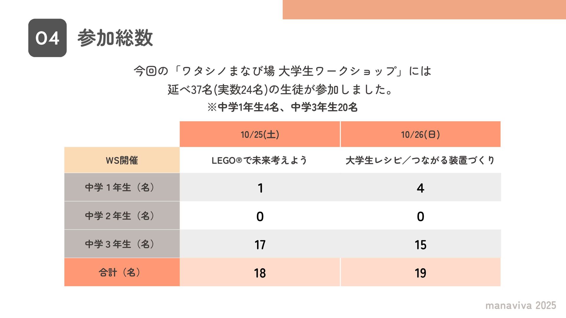 0 中学3年生(名) 17 15 合計(名) 18 19 参加総数 04 今回の「ワタシノまなび場 大学生ワークショップ」には 延べ37名(実数24名)の生徒が参加しました。 ※中学1年生4名、中学3年生20名 manaviva 2025