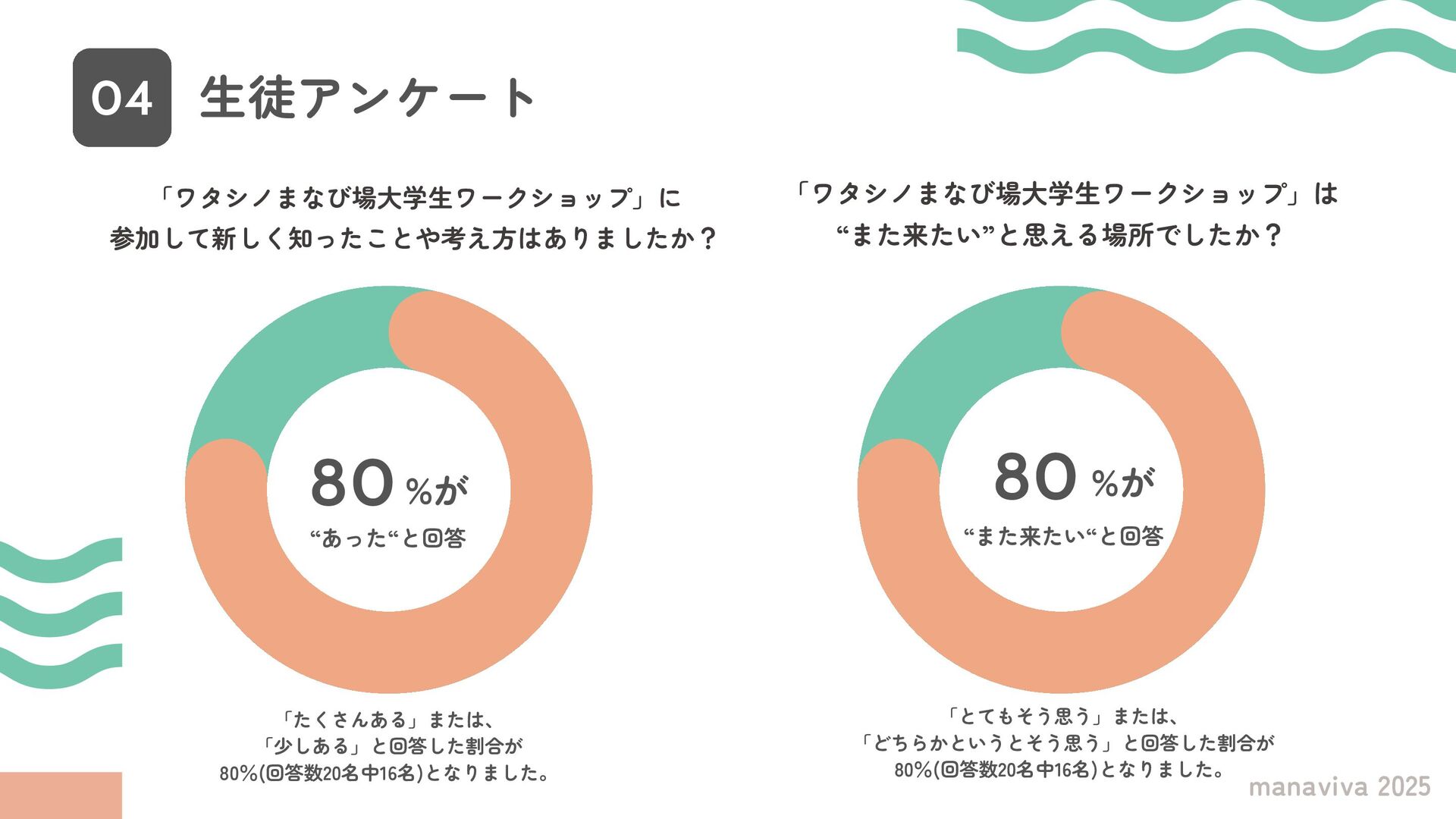 生徒アンケート 04 80%が “あった“と回答 「ワタシノまなび場大学生ワークショップ」に 参加して新しく知ったことや考え方はありましたか? manaviva 2025 「たくさんある」または、 「少しある」と回答した割合が