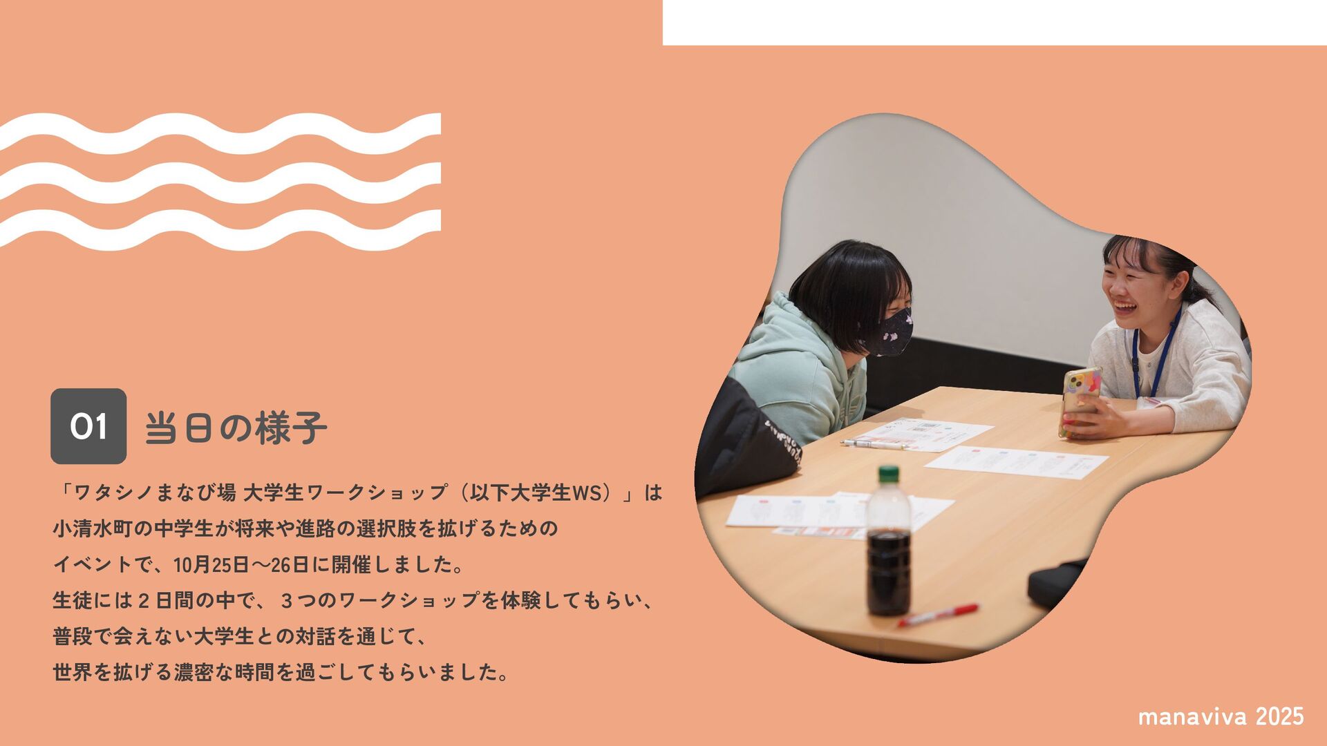 当日の様子 01 manaviva 2025 「ワタシノまなび場 大学生ワークショップ(以下大学生WS)」は 小清水町の中学生が将来や進路の選択肢を拡げるための イベントで、10月25日 ~26日に開催しました。 生徒には2日間の中で、3つのワークショップを体験してもらい、