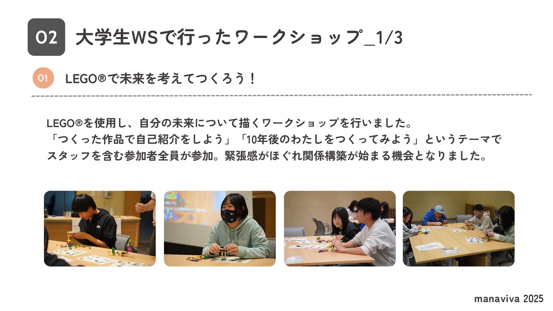 01 01 大学生WSで行ったワークショップ_1/3 02 LEGO®を使用し、自分の未来について描くワークショップを行いました。 「つくった作品で自己紹介をしよう」「10年後のわたしをつくってみよう」というテーマで スタッフを含む参加者全員が参加。緊張感がほぐれ関係構築が始まる機会となりました。 LEGO®で未来を考えてつくろう! manaviva 2025