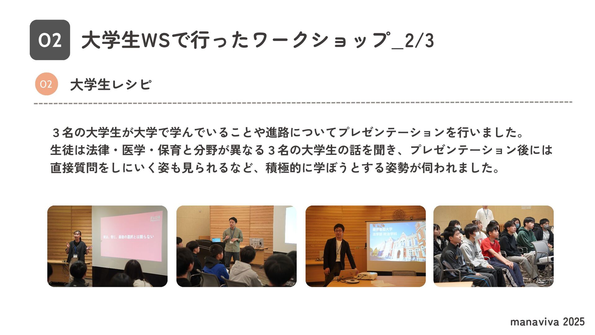 01 02 大学生WSで行ったワークショップ_2/3 02 manaviva 2025 3名の大学生が大学で学んでいることや進路についてプレゼンテーションを行いました。 生徒は法律・医学・保育と分野が異なる3名の大学生の話を聞き、プレゼンテーション後には 直接質問をしにいく姿も見られるなど、積極的に学ぼうとする姿勢が伺われました。 大学生レシピ