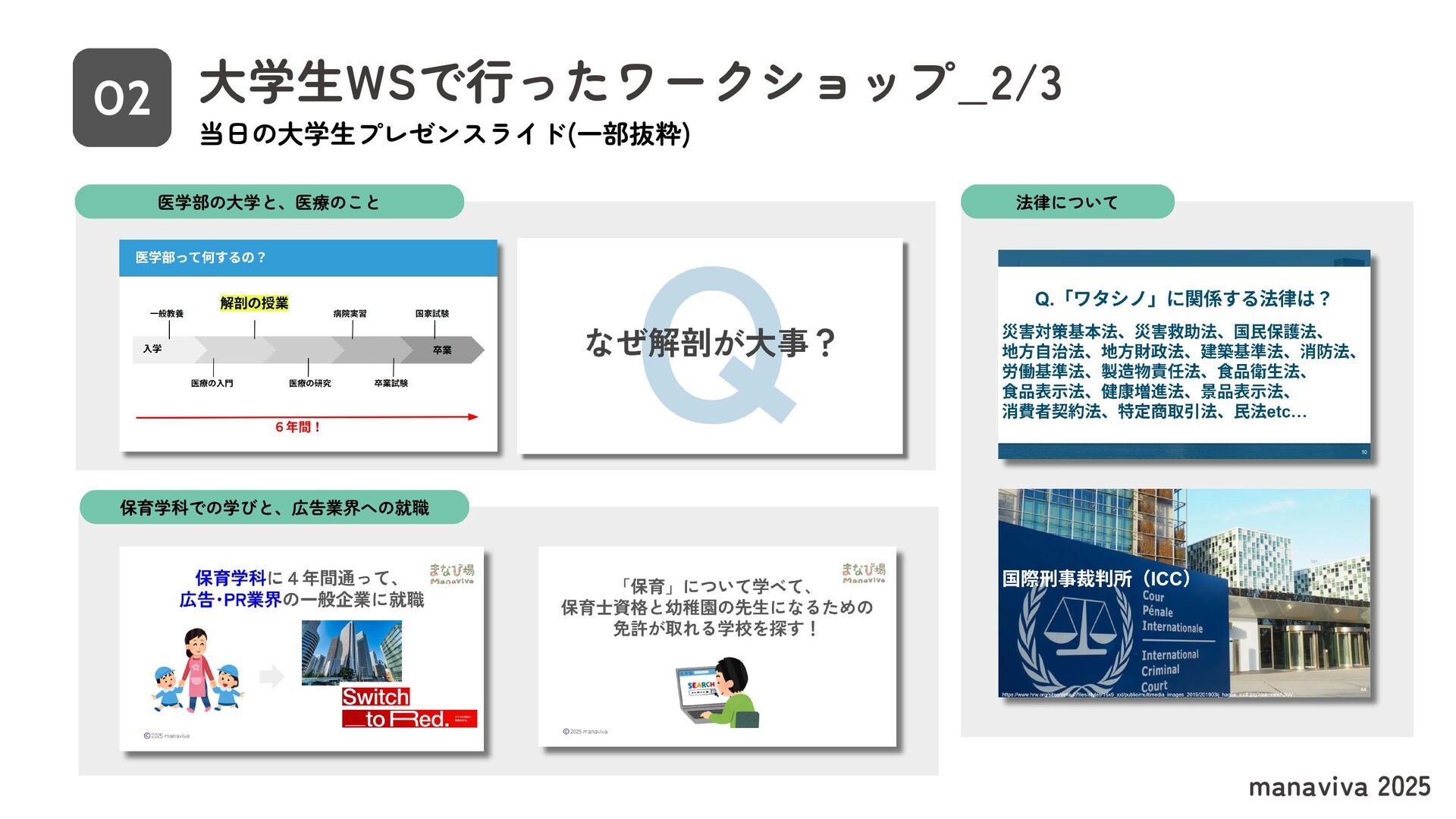 医学部の大学と、医療のこと 保育学科での学びと、広告業界への就職 法律について 大学生WSで行ったワークショップ_2/3 02 manaviva 2025 当日の大学生プレゼンスライド(一部抜粋)