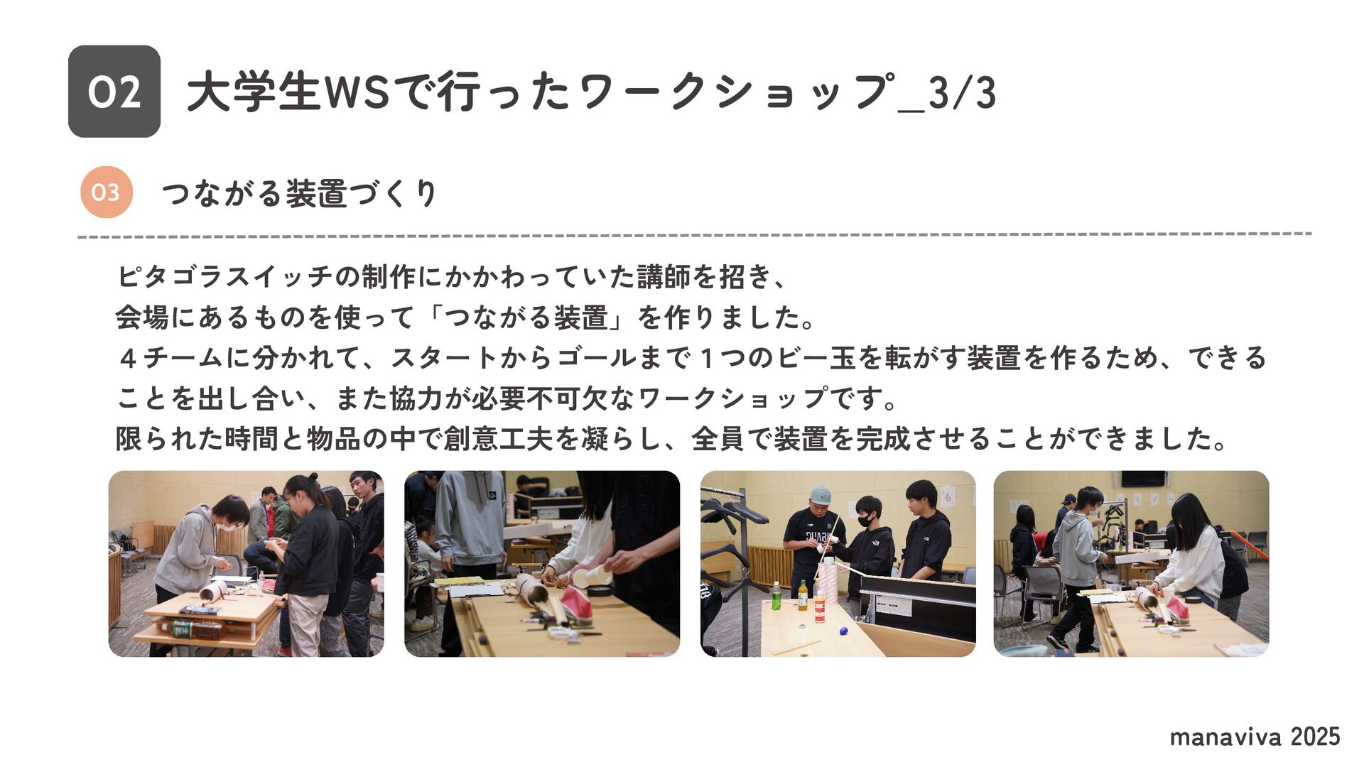 01 03 大学生WSで行ったワークショップ_3/3 02 manaviva 2025 ピタゴラスイッチの制作にかかわっていた講師を招き、 会場にあるものを使って「つながる装置」を作りました。 4チームに分かれて、スタートからゴールまで1つのビー玉を転がす装置を作るため、できる ことを出し合い、また協力が必要不可欠なワークショップです。