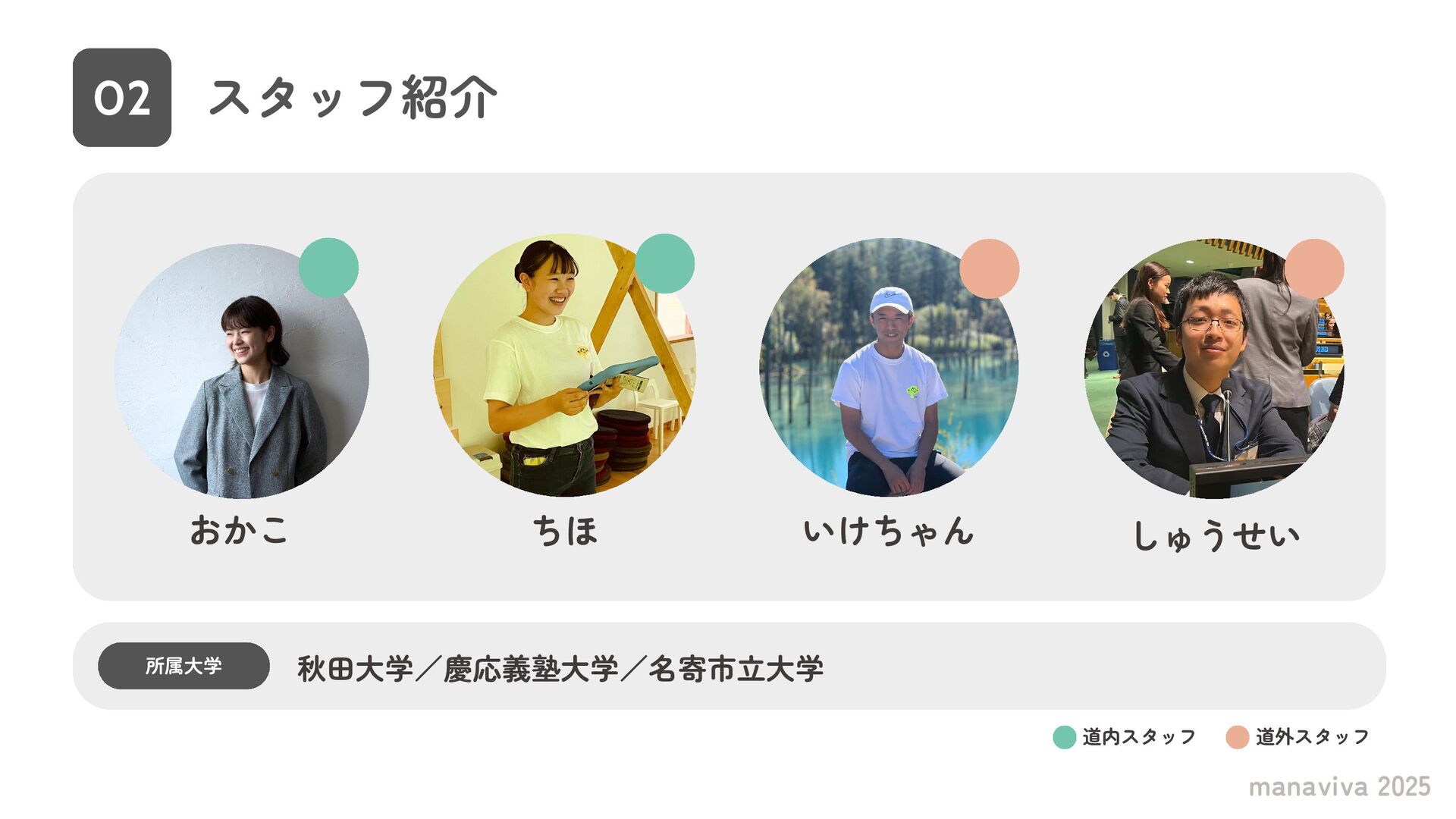道外スタッフ 道内スタッフ おかこ ちほ しゅうせい いけちゃん スタッフ紹介 02 所属大学 秋田大学/慶応義塾大学/名寄市立大学