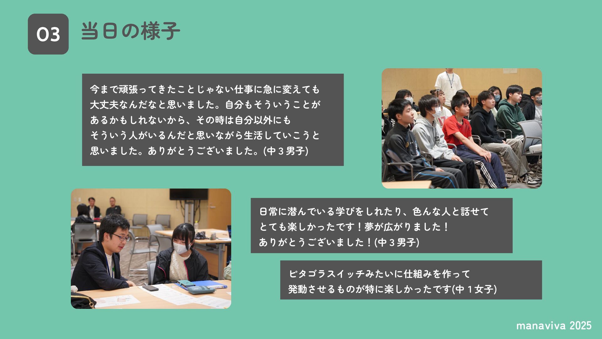 今まで頑張ってきたことじゃない仕事に急に変えても 大丈夫なんだなと思いました。自分もそういうことが あるかもしれないから、その時は自分以外にも そういう人がいるんだと思いながら生活していこうと 思いました。ありがとうございました。(中3男子) manaviva 2025 日常に潜んでいる学びをしれたり、色んな人と話せて とても楽しかったです!夢が広がりました! ありがとうございました!(中3男子)